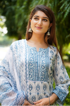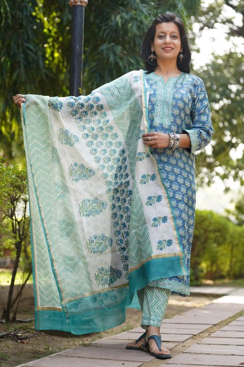 Mogra Blue Block Print Cotton Suit Set with Kota Dupatta