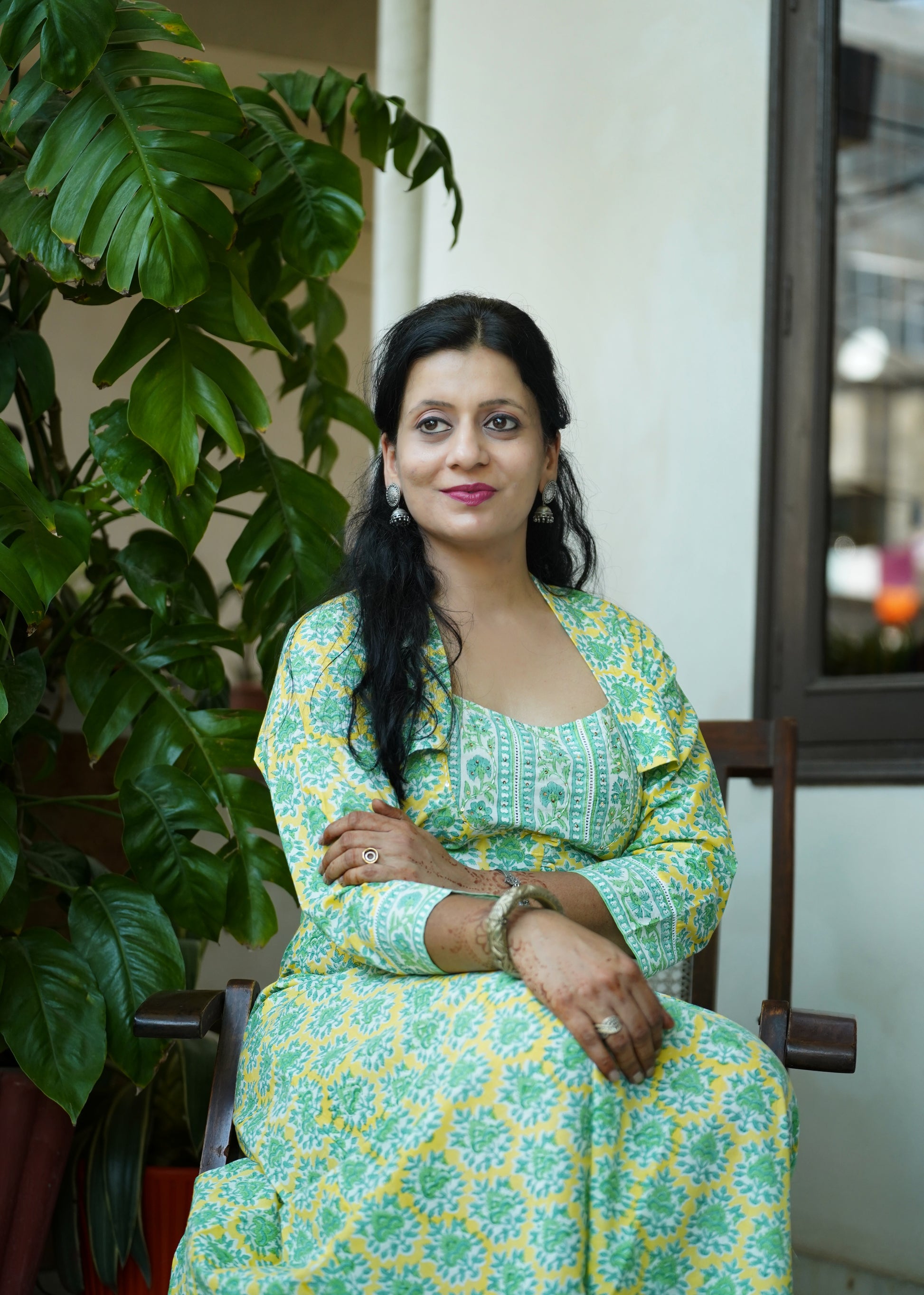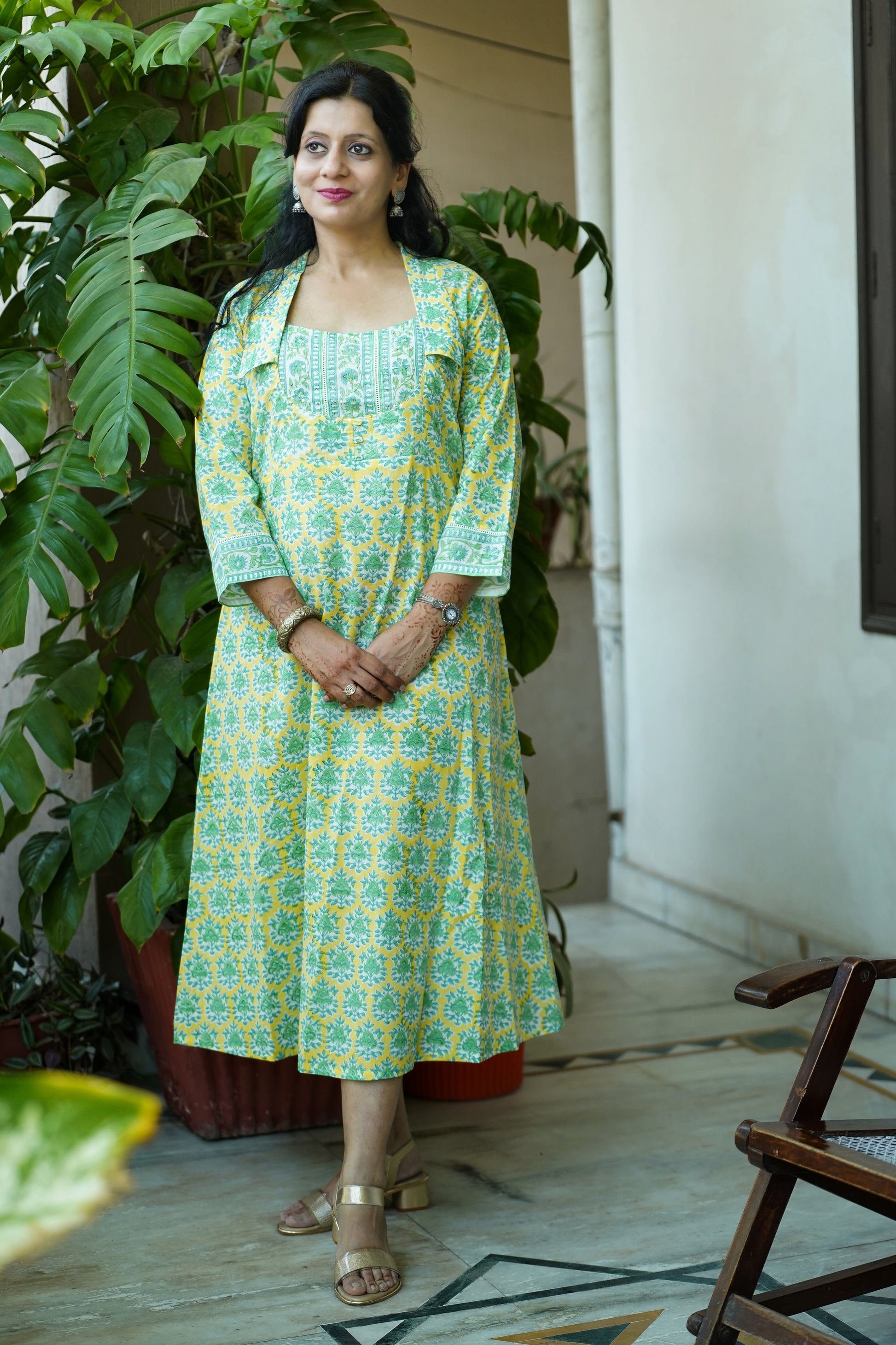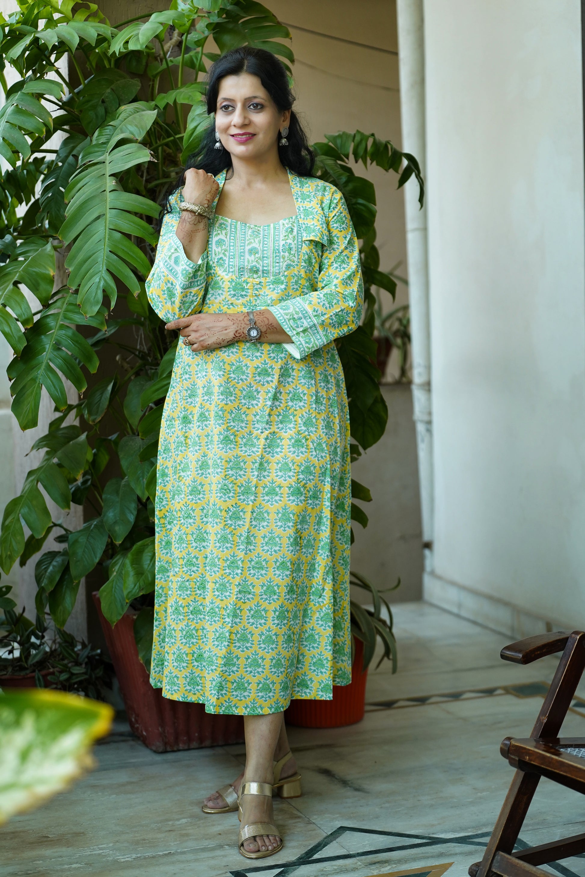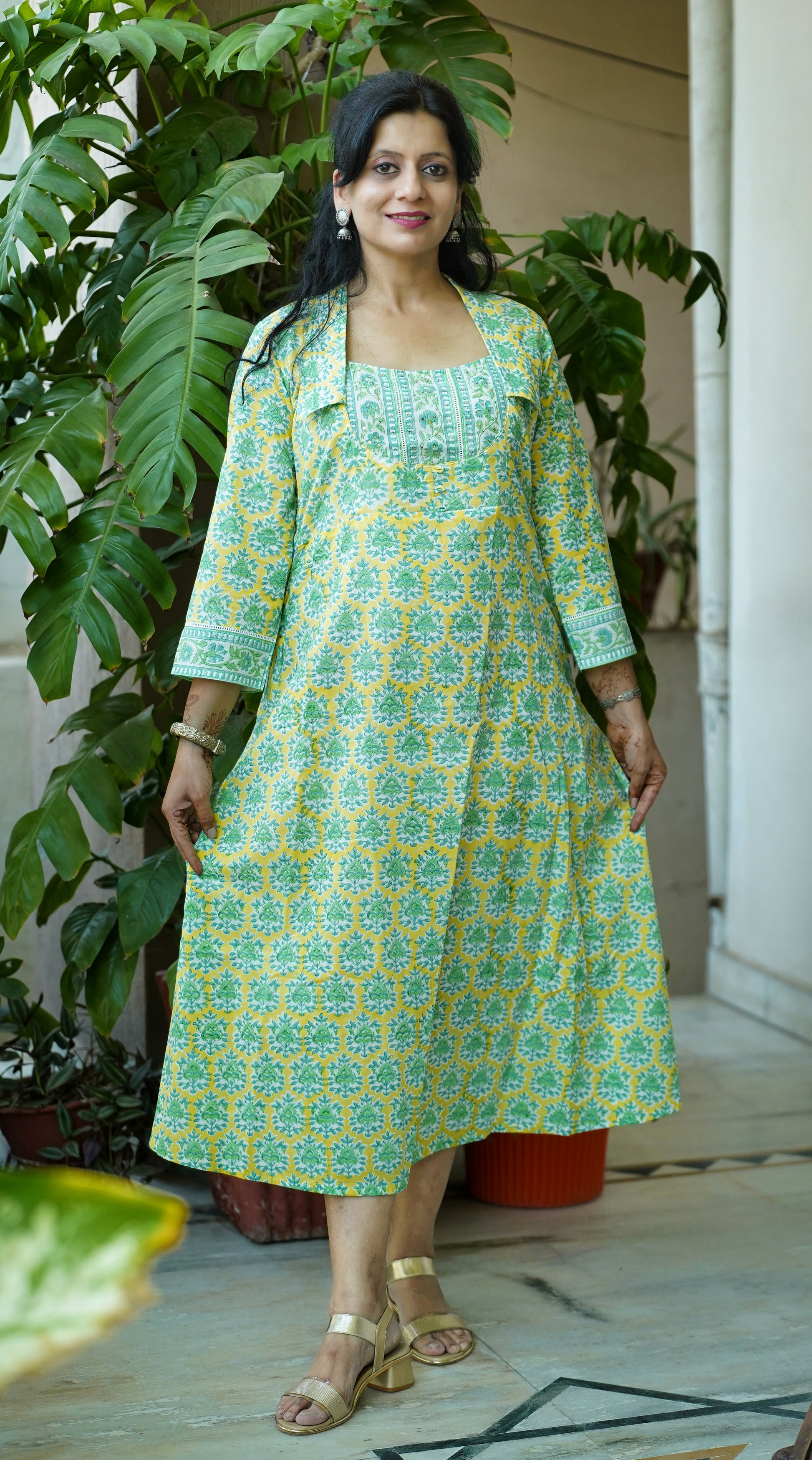 This handcrafted block print cotton dress features a vibrant yellow-green palette, brought to life through traditional printing techniques. The yoke-style neckline with a smart collar adds structure and elegance, while delicate sequins handwork brings a touch of festive sparkle.