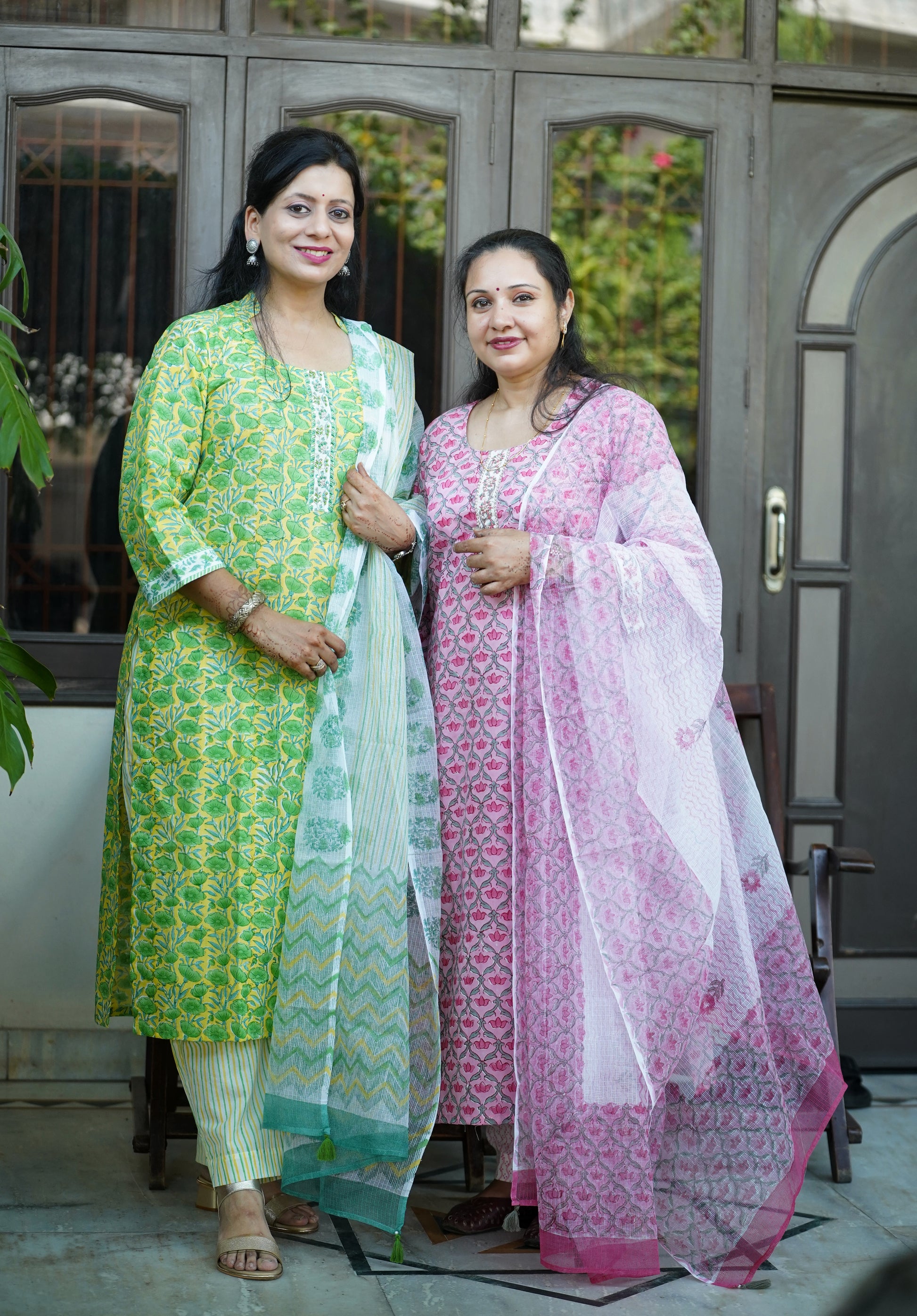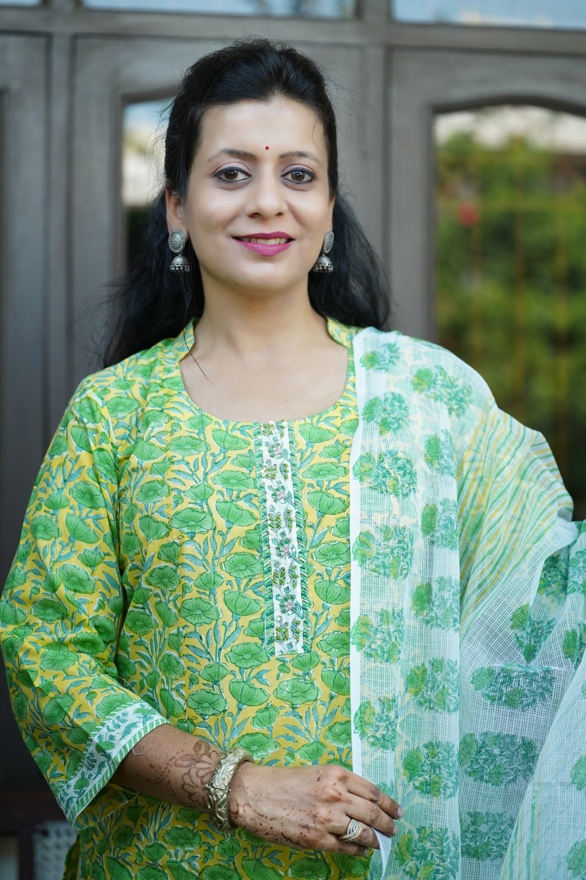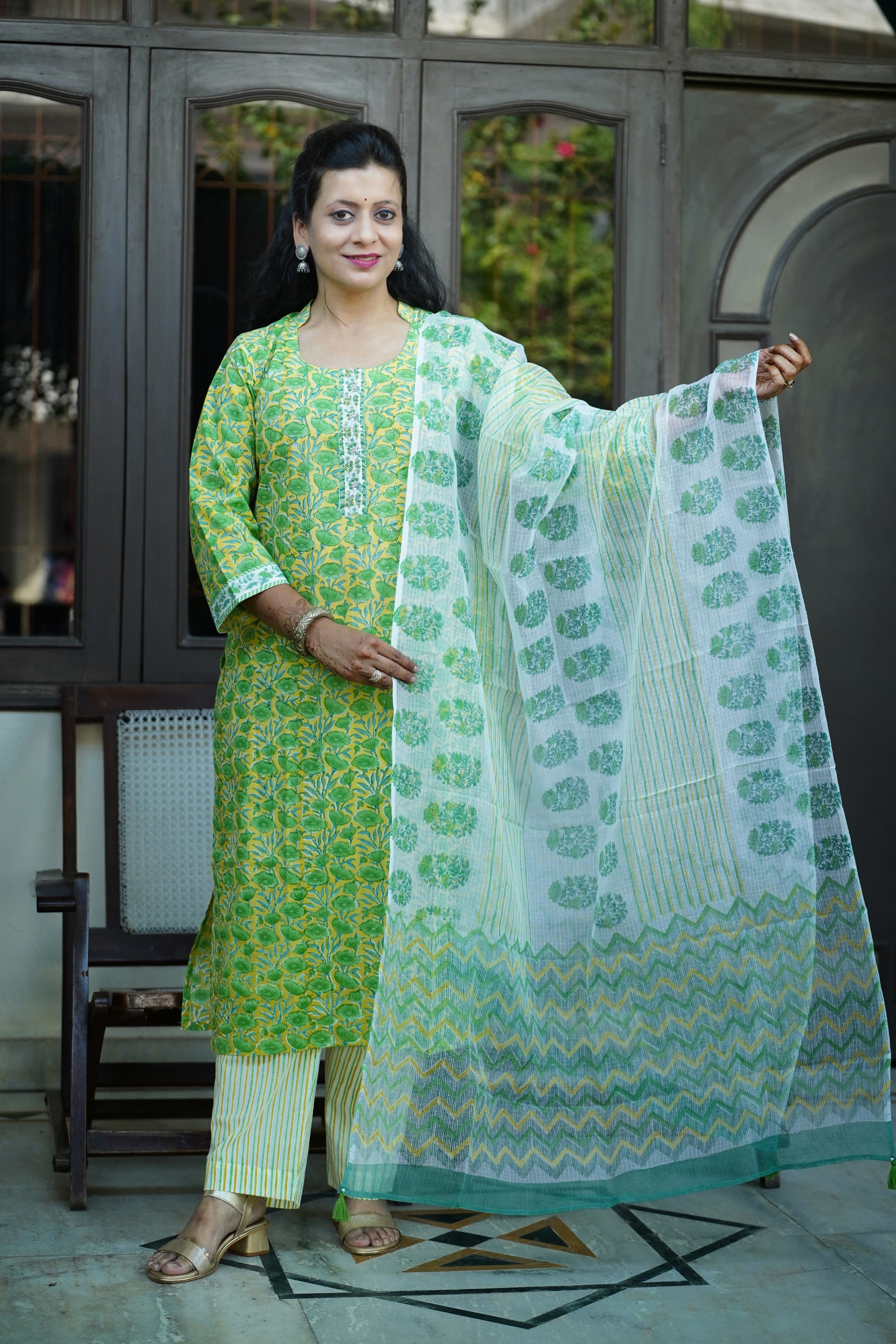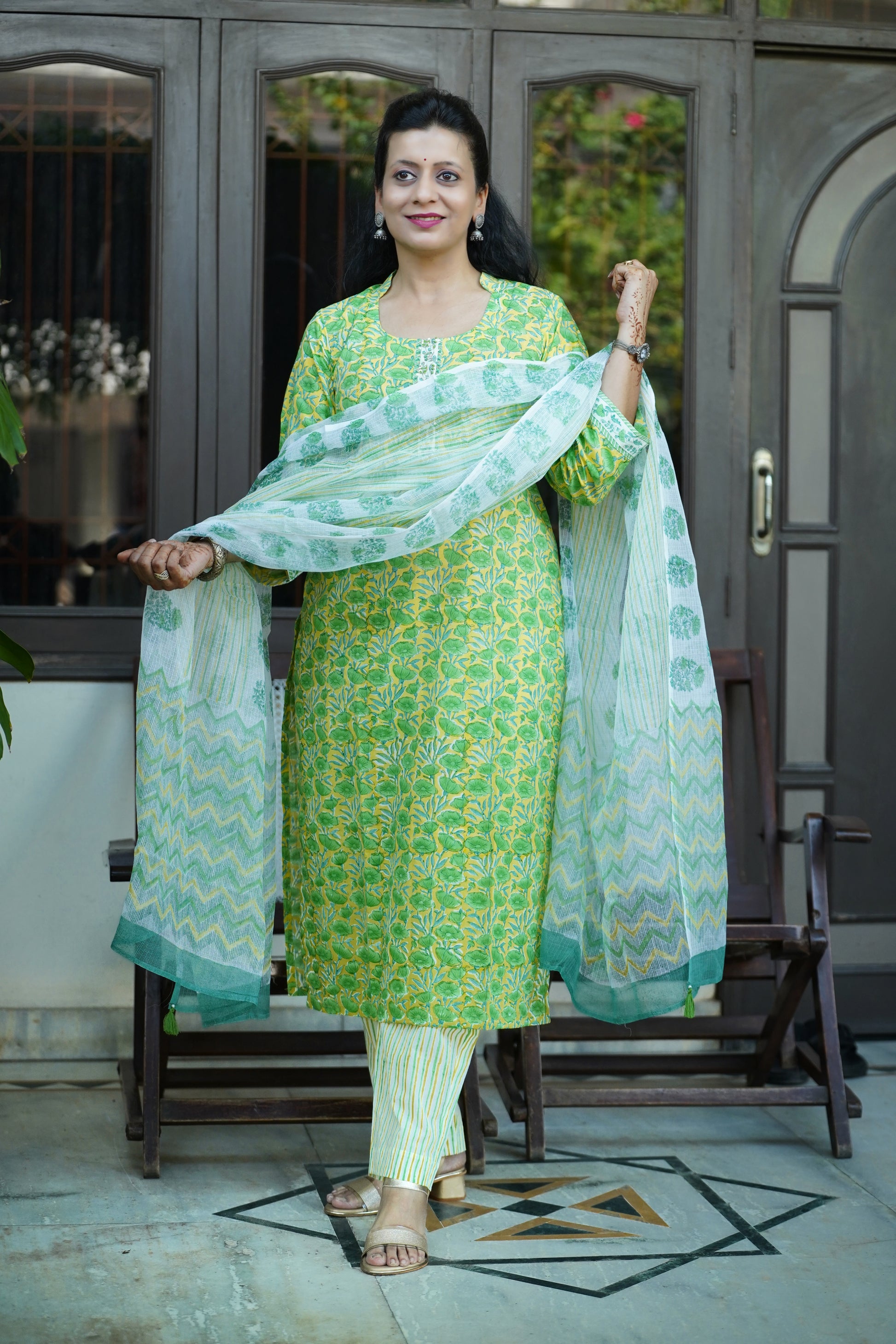 Sugandha Basanti- Handblock Printed Yellow Green Cotton Suit Set | Floral Jaal Design | Kota Doria Dupatta