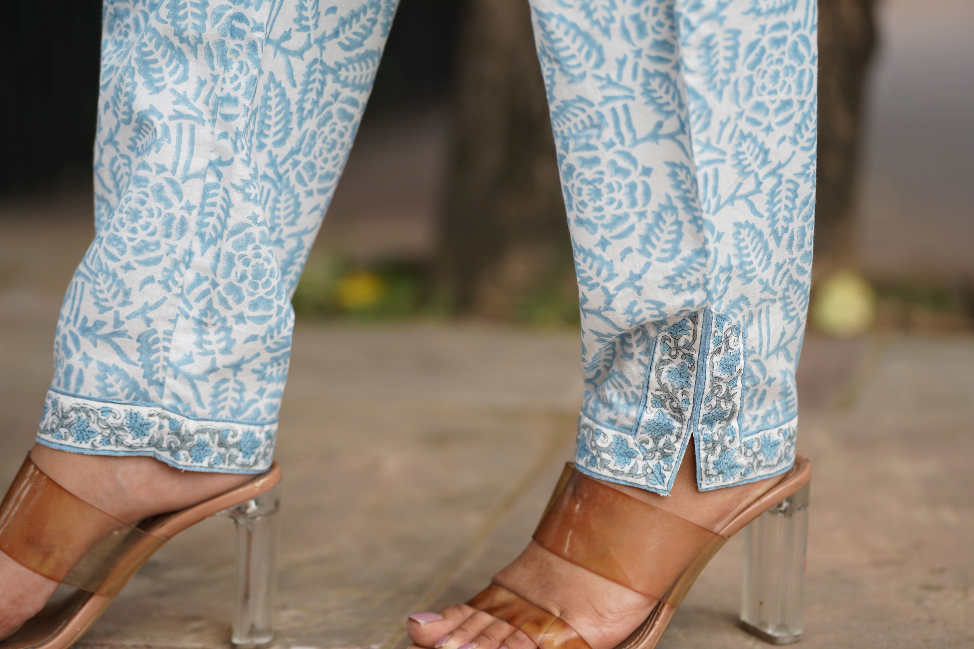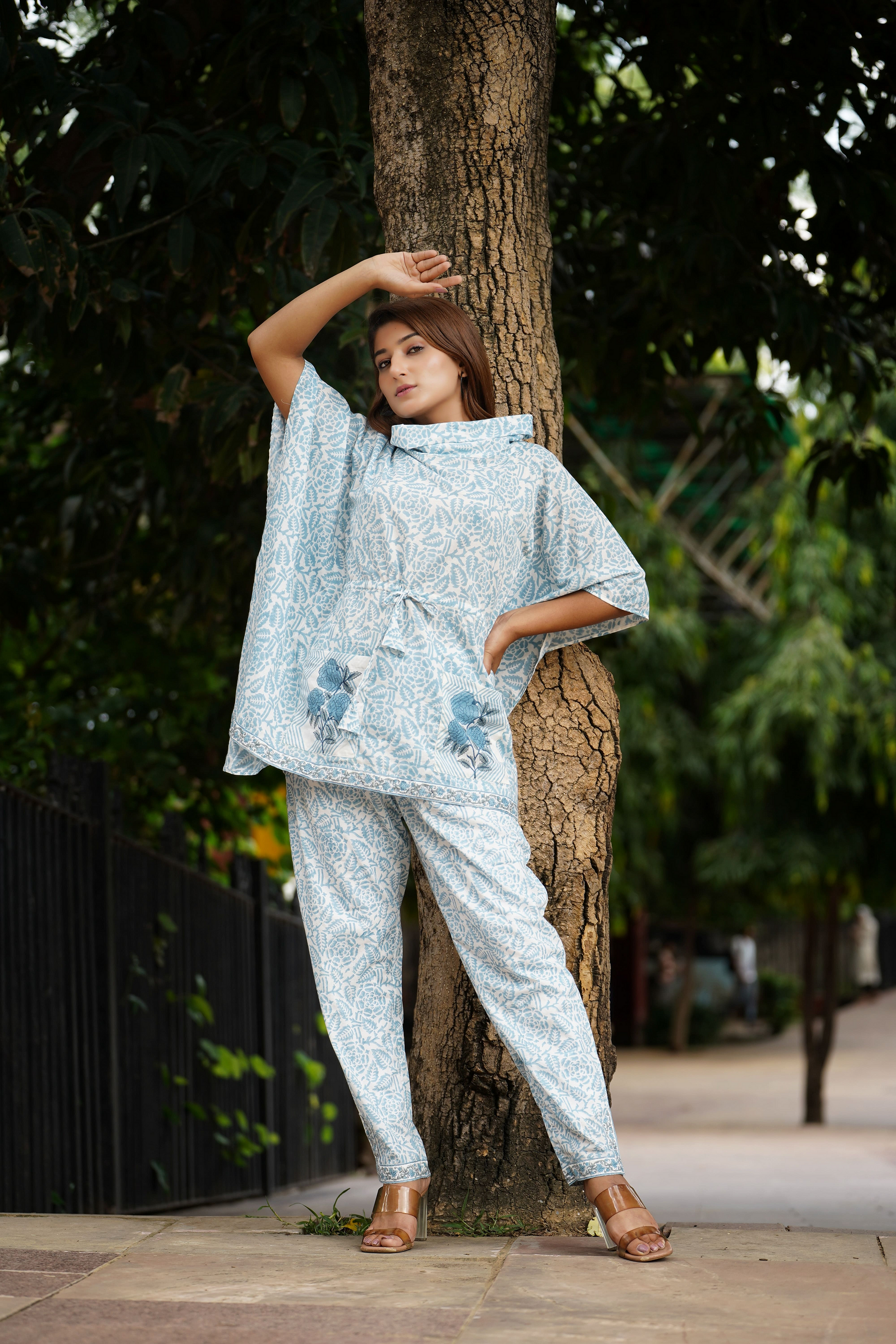 A stylish block printed cowl neck kaftan coordset exudes effortless elegance. The rose print pockets not only add to the charm of this kaftan but also are very convenient. Teamed with a stylish scarfs and cotton pants, this breezy super soft cotton outfit is a perfect pick for this season.