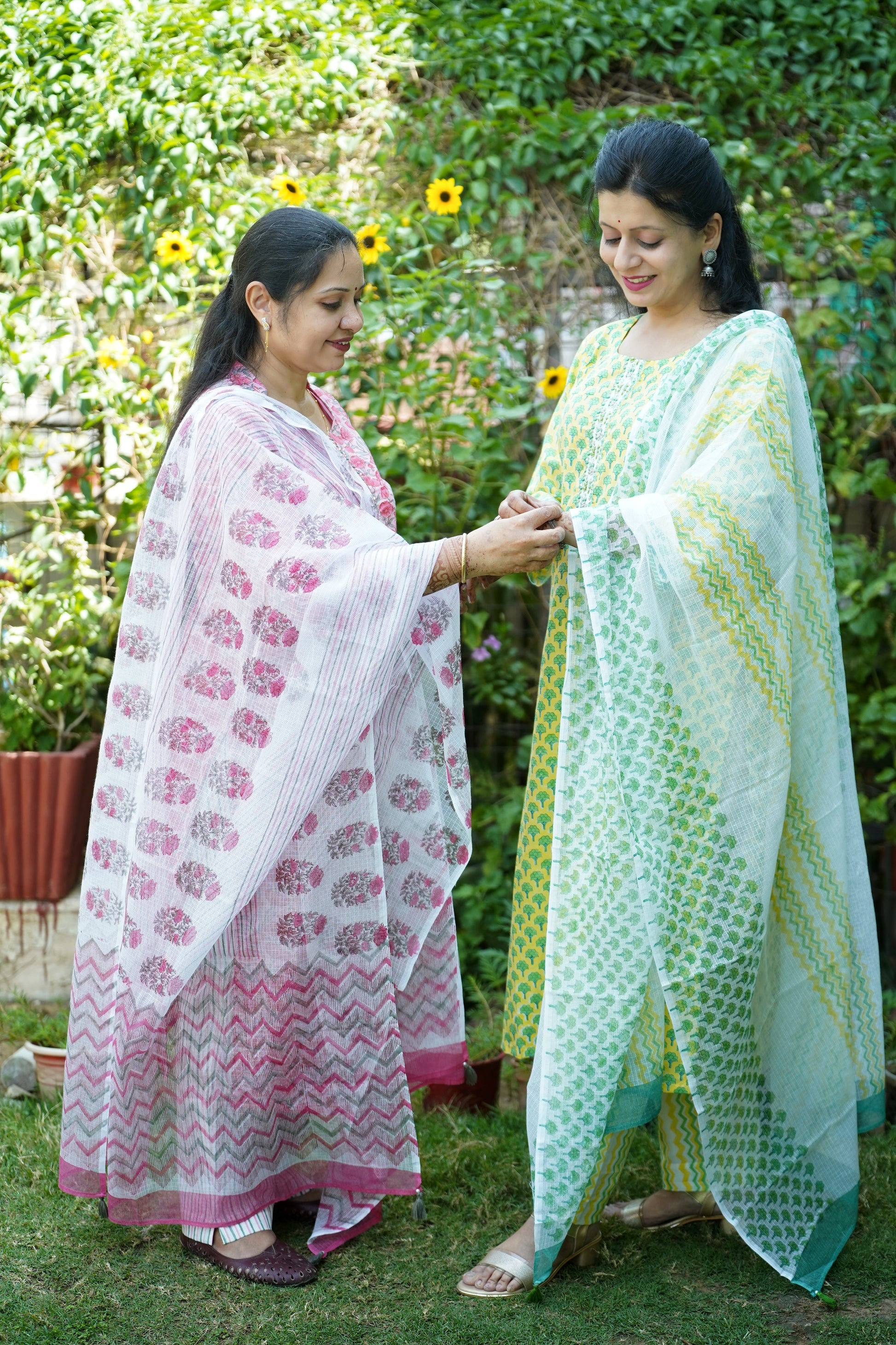Soft breathable cotton suit set in shades of yellow green in handcrafted mogra block print – smart collar placket – elegant kota dupatta with tassels– sustainable, comfortable, perfect for everyday and festive wear.
