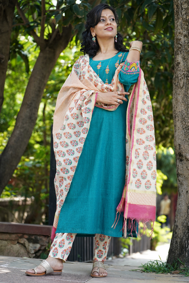 Nargis Kalamkari, Kantha Blockprint Teal Suit Set