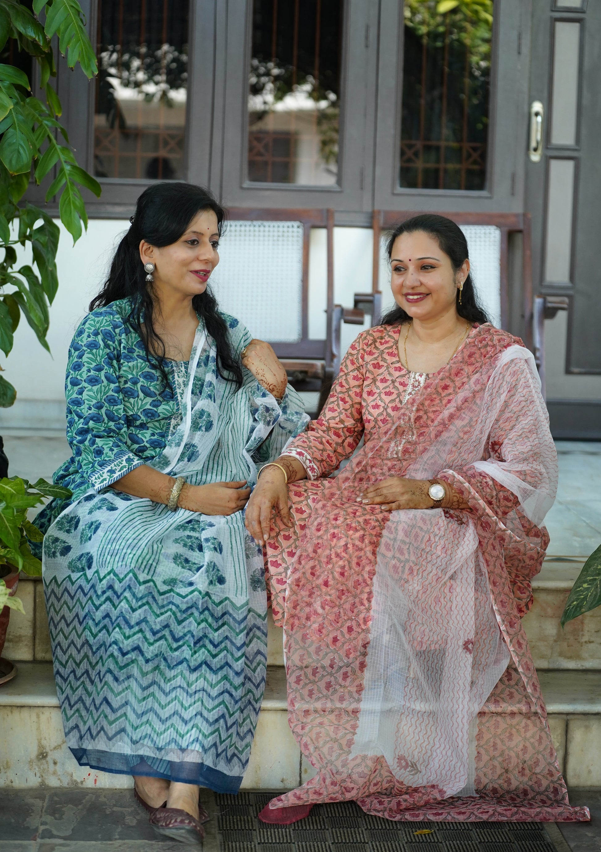 "Sheesh Mahal"- Hand block Printed peach Cotton Suit Set | Mughal Jaal Design | Kota Doria Dupatta| Hand embroidery placket