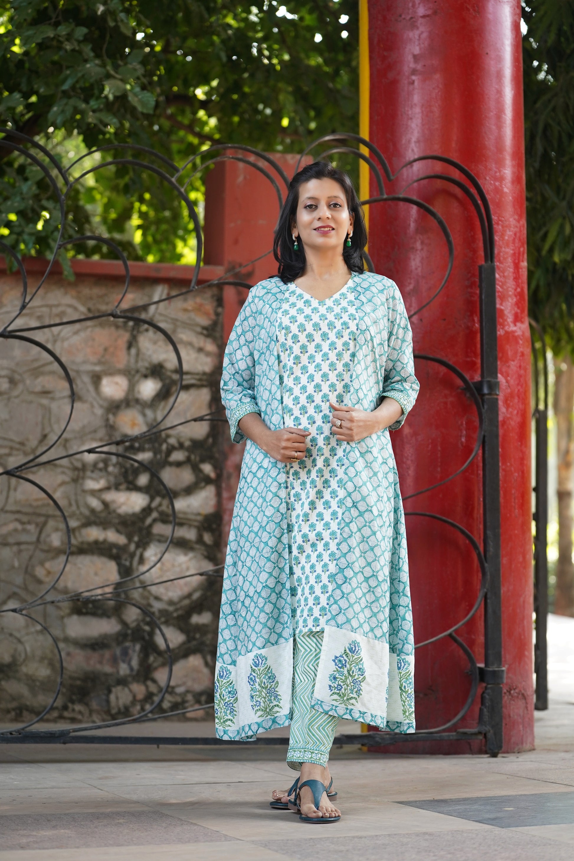 Swirl around in this breezy soft MUSLIN SILK double layer Kurta/ dress with a 40s cotton drill inner. This ensemble that can also be worn as separates showcases a medley of hand block-printed patterns.. Available in a soothing peacock blue and green color palette in unique peacock feather motifs, this stylish wear will surely give you many compliments. The fabric is winter friendly and super comfortable. Pair with plain white or printed bottoms for a perfect look.